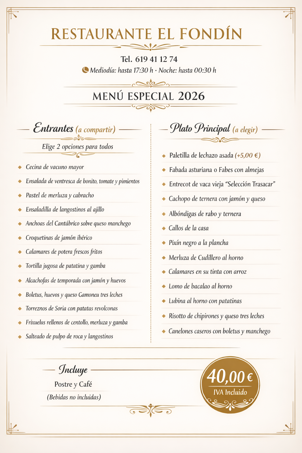 Cuando el grupo lo merece, el espacio también. A partir de 26 personas podéis reservar el comedor completo y tener El Fondín solo para vosotros, hasta un máximo de 35 comensales. Más cómodo, más íntimo y pensado para disfrutar sin prisas.